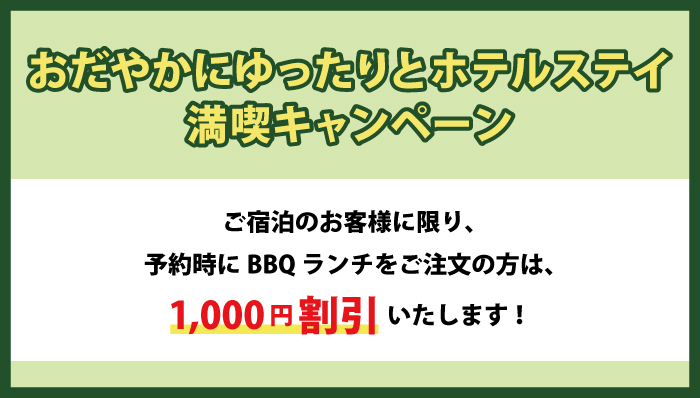 ご宿泊のお客様に限り、ご予約時にBBQランチをご注文の方は1,000円割引いたします!